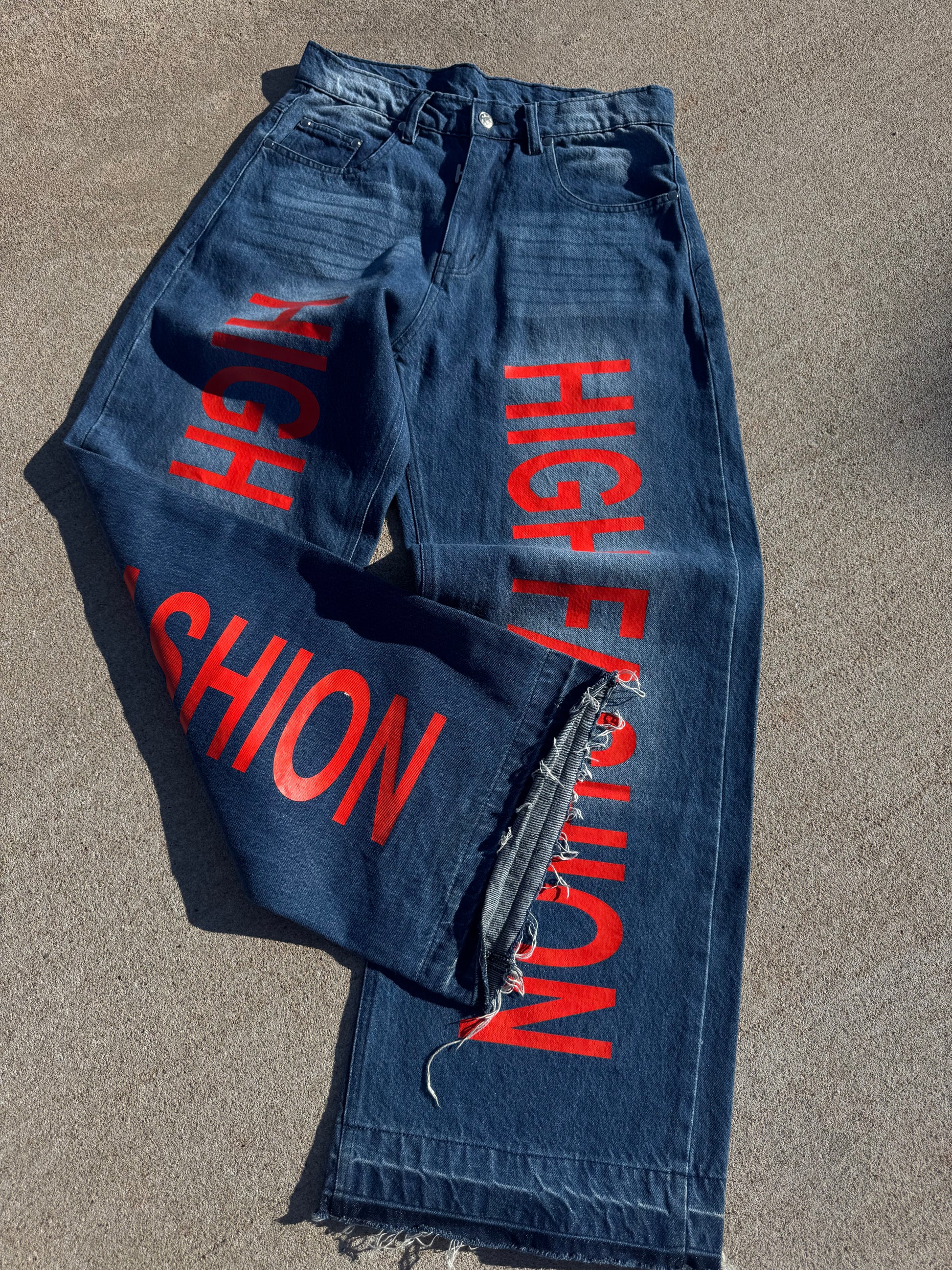 Blue denim with red “HIGH FASHION”